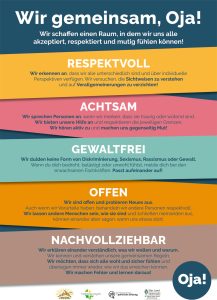 Im Rahmen des Projekts „Braver Spaces in der OJA“ leistete der Steirische Dachverband der Offenen Jugendarbeit in Kooperation mit beteiligung.st, gefördert von der Österreichischen Gesellschaft für politische Bildung 2024/2025, einen entsprechenden Beitrag für ein gutes Miteinander. Neben einer Prozessbegleitung an zwei Standorten der Offenen Jugendarbeit haben alle OJA-Standorte in der Steiermark Plakate erhalten, die auf zentrale Mindestkriterien für ein friedvolles Miteinander in der Offenen Jugendarbeit aufmerksam machen sollen.