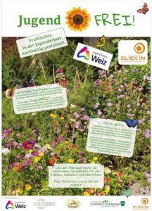 Bilderbeschreibung: Verleihung der Plakette JugendFREI in Gleisdorf, Foto: Naturschwärmerei; Insektenfreundliches Staudenbeet anlegen, Foto: Juz Hartberg und Gartenbiotop, UMF Quartier Europahaus am Steinberg, Foto: Naturschwärmerei